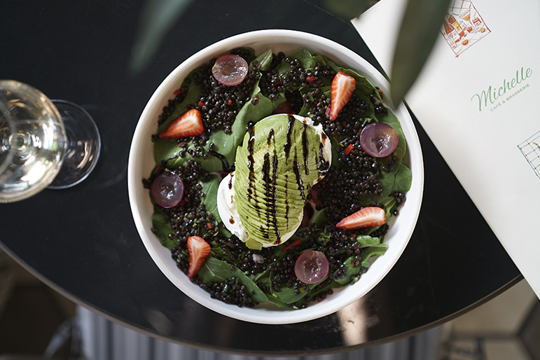 Domates, Roka, Mevsim Meyveleri, Beluga Mercimek, Balsamic Glaze • 278 Kcal